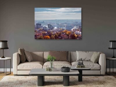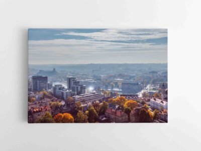 Tai paveikslas ant drobės, kuriame atsiskleidžia pajūrio miesto horizontas – žalių medžių jūra, raudonų stogų ritmas ir modernūs aukštybiniai akcentai tolumoje. Šviesus, skaidrus dangus su lengvais debesimis suteikia vaizdui erdvės ir gaivumo pojūtį.