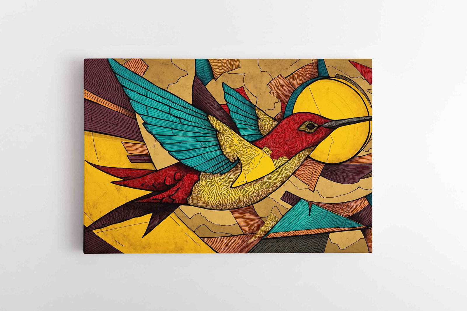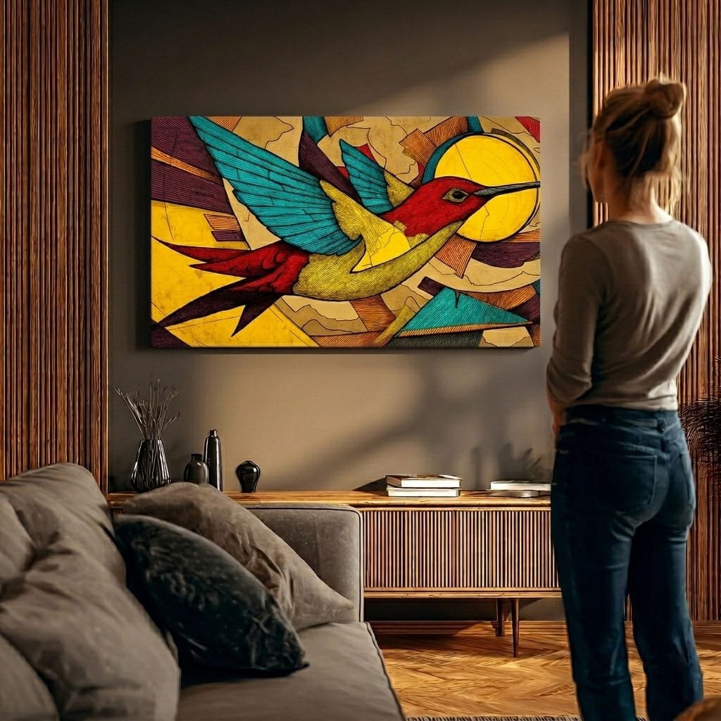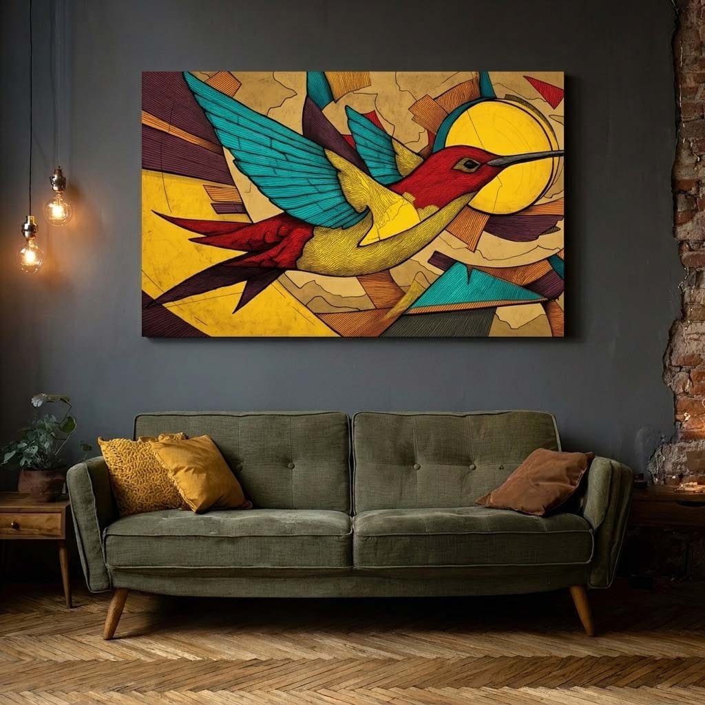 Raktažodžiai: paukščio paveikslas, Kolibris, spalvingas paveikslas, modernus abstraktus menas, geometrinis dizainas, ryškus interjero akcentas, paveikslas ant drobės, sienų dekoras, Jėgelė.lt