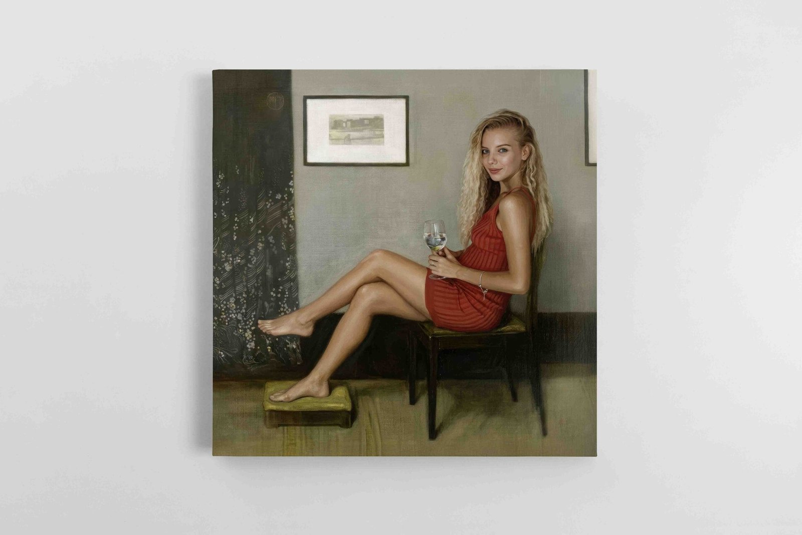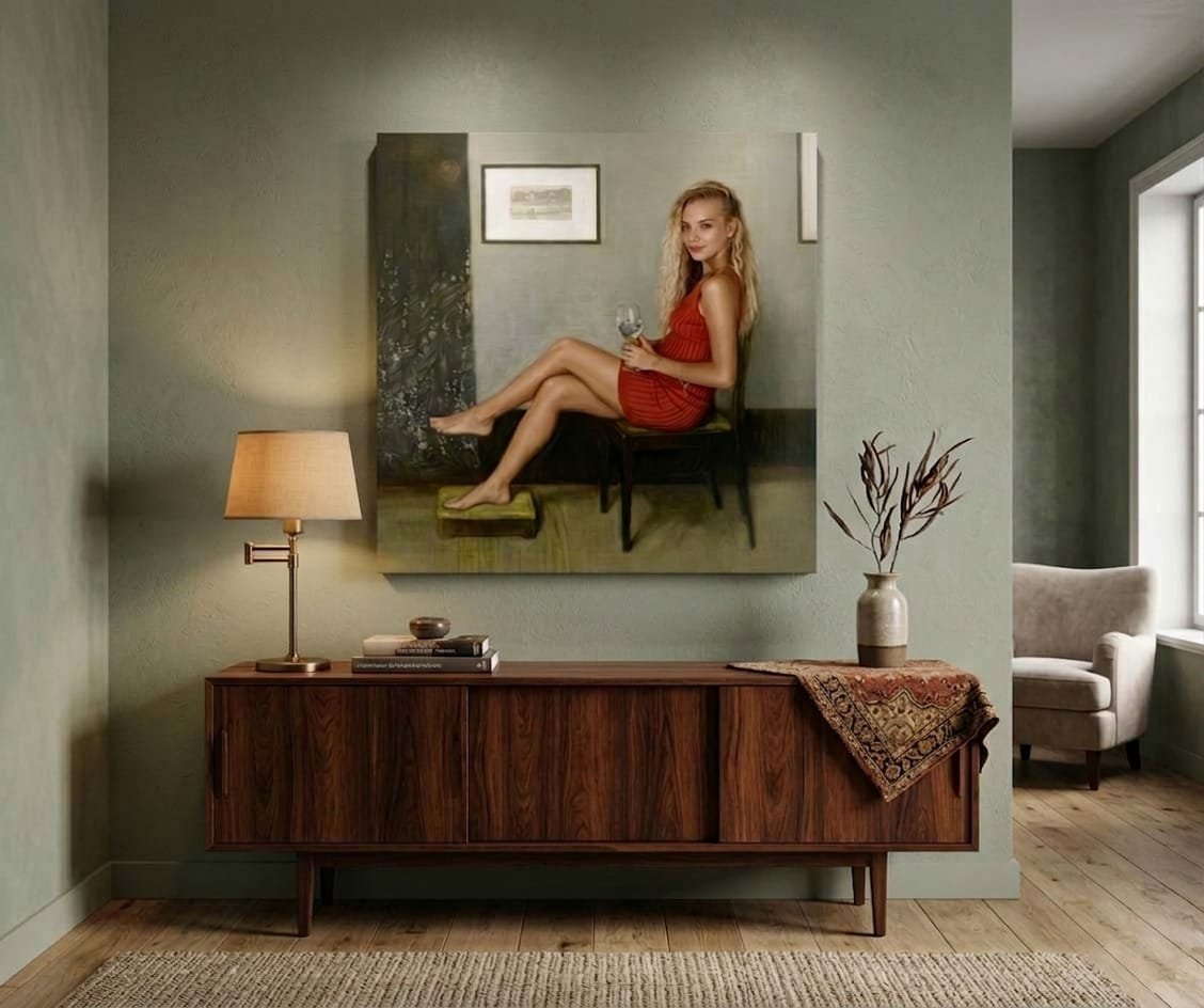 Šis paveikslas išsiskiria ne tik estetine ramybe, bet ir paslėpta humoro gaida. Jame jaučiamas intelektualus žaidimas su meno istorija – tarsi klasikinis portretas būtų trumpam išėjęs iš taisyklių rėmų, atsipalaidavęs, įsipylęs taurę vyno ir nusprendęs būti šiek tiek modernesnis. Būtent todėl kūrinys atrodo gyvas, intriguojantis ir lengvai įsimenantis.
